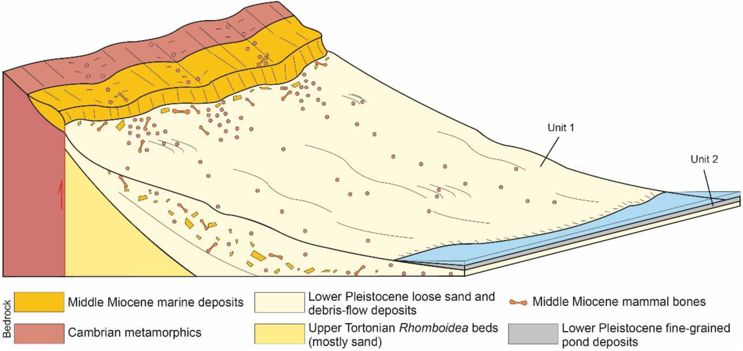 On the lowest layers of the ground of this area, you’ll find ancient rocks from the Cambrian period, over ½ billion years old. These are partially covered by younger deposits from the Miocene when the Pannonian Sea still existed. As said earlier, a landslide has redeposited old rocks in fragments, mixed with debris (unit 1). In a later stage, marshes or smaller, shallow lakes formed on top of this debris, where finer sediments slowly settled (unit 2).