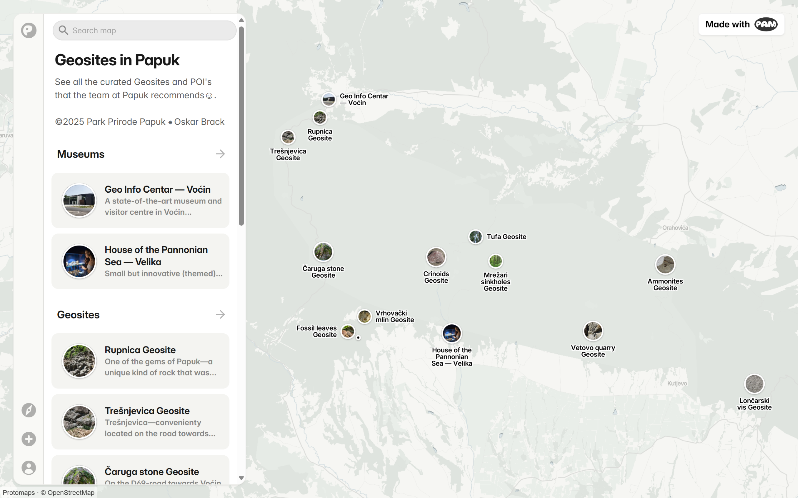 Starting with the origins and disappearance of the sea, in the section The Lost Sea. The story then continues to tell you about Papuk―today a mountain, but once an island in this sea. Traces of the Past tell the story of the marine life at that time, while Sites that tell the story show where in Park you can still find old unique geological features from this time. From Sea to Geopark describes the preservation efforts and its effects on geological heritage. And Dive into the Sea gives a brief intro of what’s to see at the House of the Pannonian Sea, where you can go and experience more of this vanished sea. Lastly, there are the Credits and Sources that link back to the original sources for transparency.
