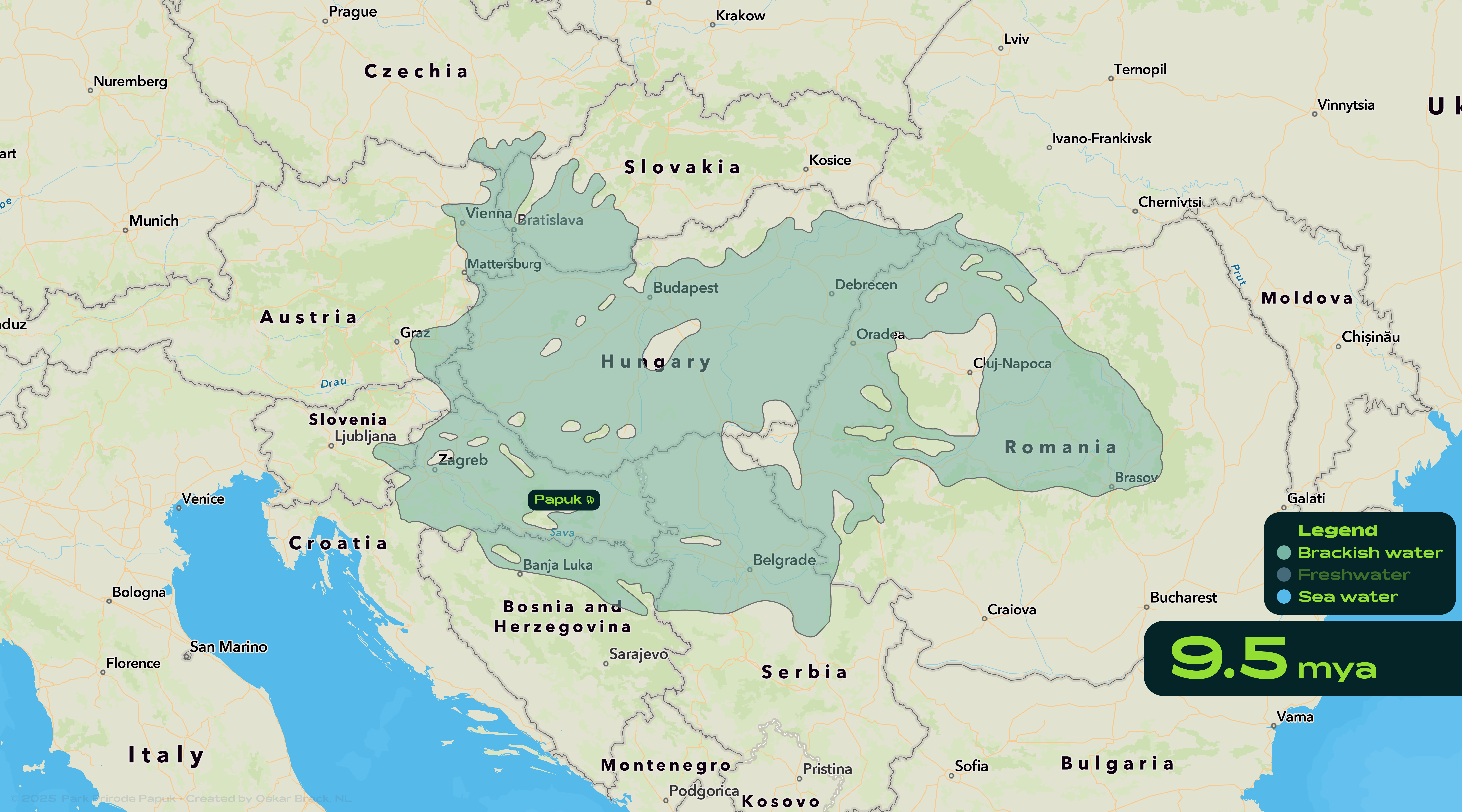 At the time of its separation from the Paratethys, around 12 million years ago, the Pannonian Sea covered a large area in Central Europe. When it was at its largest size ~9.5 million years ago, the Pannonian Sea covered large parts of present-day Croatia, Slovakia, Serbia and Romania, plus almost the entirety of Hungary. It even reached a little part of Bosnia and Herzegovina, Czechia, Austria, Slovenia and Ukraine. The total lake cover-area was an impressive ~250.000km², measuring ~500km wide and ~600km long.