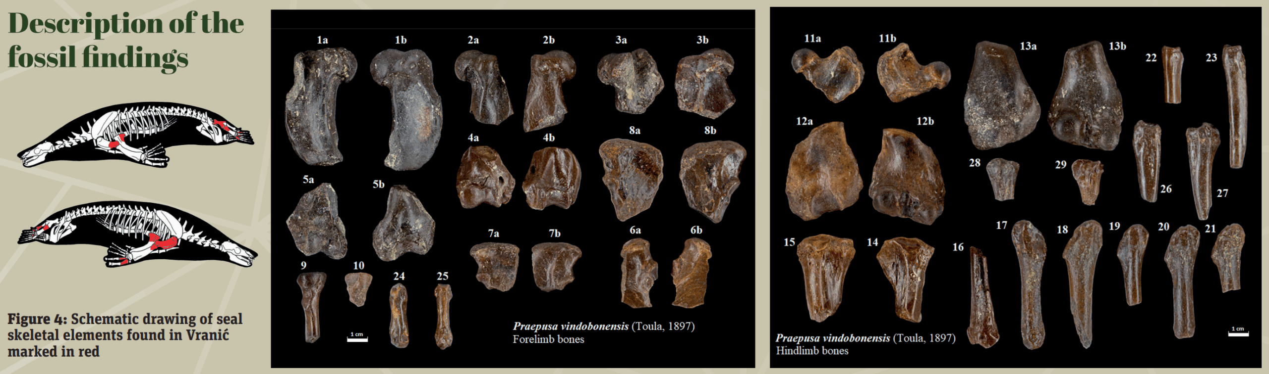 Bone measurements show that these remains match the species Praepusa vindobonensis, a small type of seal from the Early Sarmatian-period, with a body length of just over one meter. This species has unique features in the thigh and upper arm bones that make it different from other seals. It also had a relatively compact body and had adapted to live in the shallow waters of the Pannonian Sea.